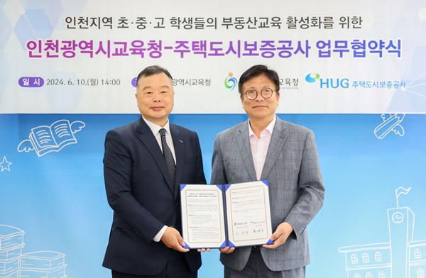 [아유경제=송예은 기자] 주택도시보증공사(HUG)는 지난 10일 인천광역시교육청(교육감 도성훈)과 인천지역 초ㆍ중ㆍ고등학교 학생들의 실생활 중심의 부동산 교육 활성화 지원을 위한 업무협약을 체결했다고 밝혔다.