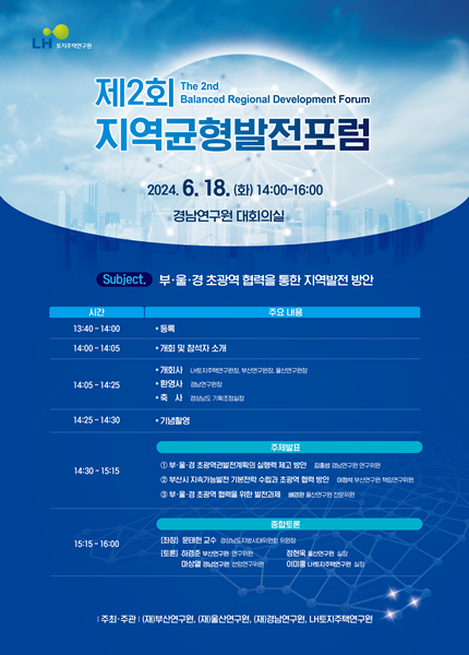 [아유경제=송예은 기자] 한국토지주택공사(LH)는 부산연구원, 울산연구원, 경남연구원과 함께 `초광역 협력을 통한 지역발전 방안`이라는 주제로 제2회 지역균형발전포럼을 개최한다고 밝혔다. 포럼은 4대 초광역권 중 부산광역시ㆍ울산광역시ㆍ경남(이하 부울경) 권역을 대상으로 진행된다.