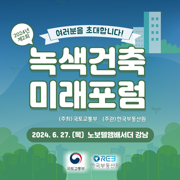[아유경제=송예은 기자] 한국부동산원(원장 손태락)은 오는 27일 국토교통부에서 주최하고 한국부동산원에서 주관하는 `2024년 제2회 녹색건축 미래포럼`을 개최한다고 전했다.