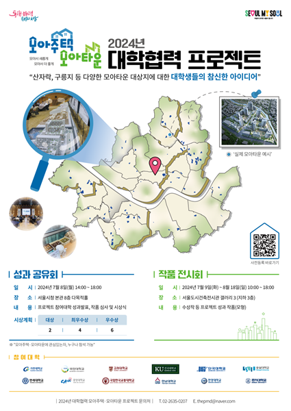 서울시는 오는 8일 `2024년 모아주택ㆍ모아타운 대학협력 프로젝트 성과공유회`를 개최하고 수상작을 포함한 우수 작품을 이달 9일부터 오는 8월 18일까지 서울도시건축전시관에 전시한다고 밝혔다.