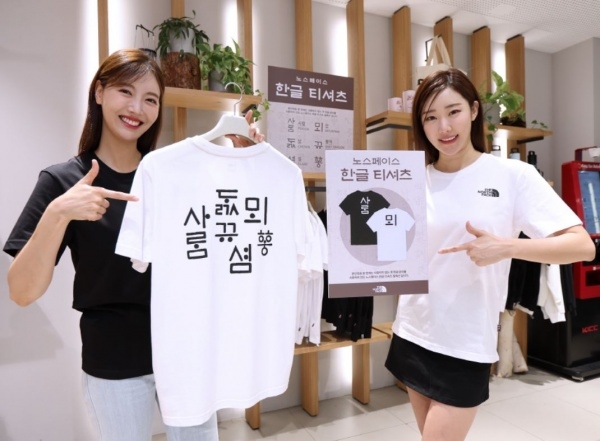 우리가 매일 말하고, 듣고, 쓰고, 보는 한글에 대한 관심과 애정을 높이고자 이번에 선보여진 ‘노스페이스 한글 티셔츠’는 '사람', '산', '닭', '왕자', '섬' 및 '(넓을) 홍'의 6개 글자와 관련해 현재는 사용되지 않는 옛 한글 타이포그래피가 적용됐다.