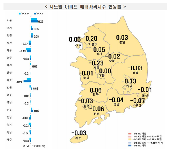 지방(-0.04%)은 시ㆍ도별로 부산(-0.07%), 대전(0%), 대구(-0.13%), 충남(-0.01%), 충북(-0.02%), 강원(0.03%), 광주(-0.03%), 울산(-0.01%), 세종(-0.23%), 전남(-0.06%), 전북(0.06%), 경남(-0.04%), 경북(-0.03%), 제주(-0.03%) 등의 결과를 보였다.