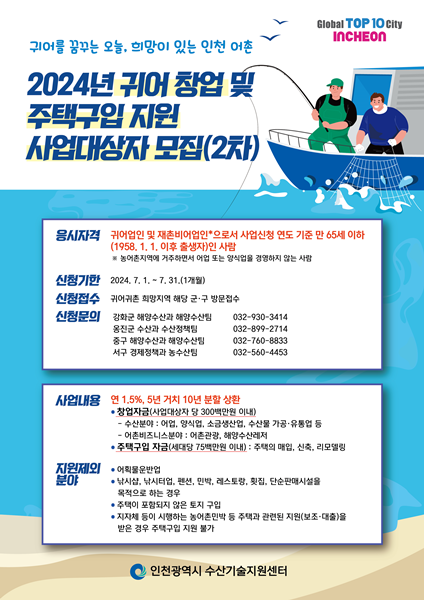 인천시 수산기술지원센터는 2024년 귀어 창업 및 주택구입 지원 사업대상자를 이달 한 달간 모집한다고 밝혔다. 귀어 창업 및 주택 구입 지원은 귀어업인이 되기를 희망하는 도시민들이 어촌지역에 안정적으로 정착할 수 있도록 창업(수산업ㆍ어촌비즈니스업) 및 주택마련자금을 저금리로 융자 지원해 어촌사회 활력을 불어넣는 사업이다.