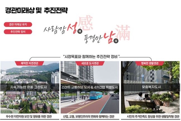 시는 `어울림의 도시, 사람 감성, 풍경 만남`이라는 미래상을 토대로 ▲그린 인프라 가치 향상 ▲주요 교통 및 산업거점 경관 명소화 및 활성화 ▲안전하고 쾌적한 도시 생활 가로경관 개선 등 3가지 추진 전략을 경관계획에 담았다.