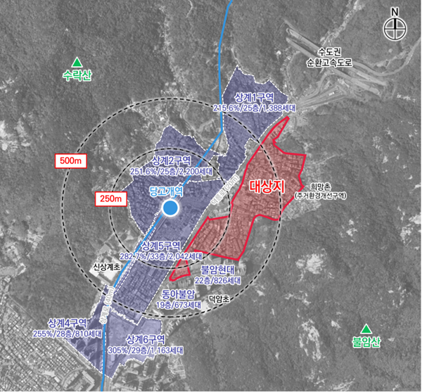 노원구 덕릉로126라길 8(상계동) 일대 12만1862.1㎡를 대상으로 하는 상계3구역은 지하철 4호선 당고개역 인근에 위치한 구역으로 공동주택 2550가구가 건립될 예정이며, 이 중 공공주택 549가구는 분양 주택과 혼합 배치하도록 계획했다.