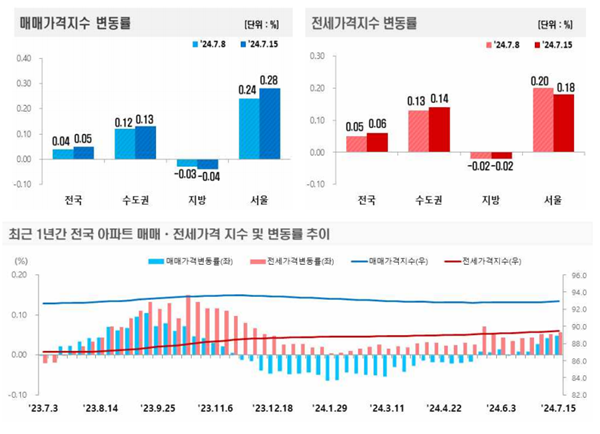 [아유경제=권혜진 기자] 최근 한국부동산원이 발표한 `주간아파트 가격동향`에 따르면 7월 3주(지난 15일 기준) 전국 아파트값은 상승(0.05%)을 기록했다. 수도권과 서울은 상승폭 확대, 지방은 하락폭 확대한 상황이다.