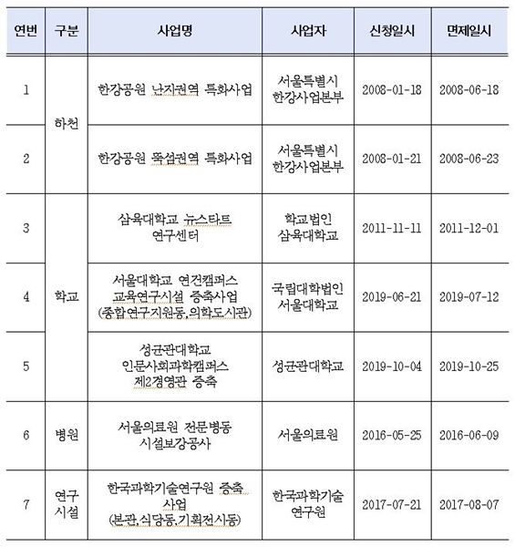 면제 요청 대상 사업은 ▲서울시 환경영향평가대상 규모의 200% 이하인 경우 ▲대상 사업으로 인한 부정적 영향에 대해 저감 대책이 충분히 세워진 경우 ▲「서울특별시 환경영향평가 조례」 제29조 제2항에 따른 심의 기준을 충족하는 경우 등 3가지 조건을 모두 만족하면 신청 가능하다. 면제 부동의 시에는 기존 환경영향평가 절차에 따라 진행된다.