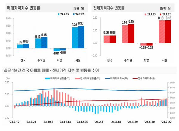 [아유경제=권혜진 기자] 최근 한국부동산원이 발표한 `주간아파트 가격동향`에 따르면 7월 4주(지난 22일 기준) 전국 아파트값은 상승(0.06%)을 기록했다. 수도권과 서울은 상승폭 확대, 지방은 하락폭 축소한 상황이다.