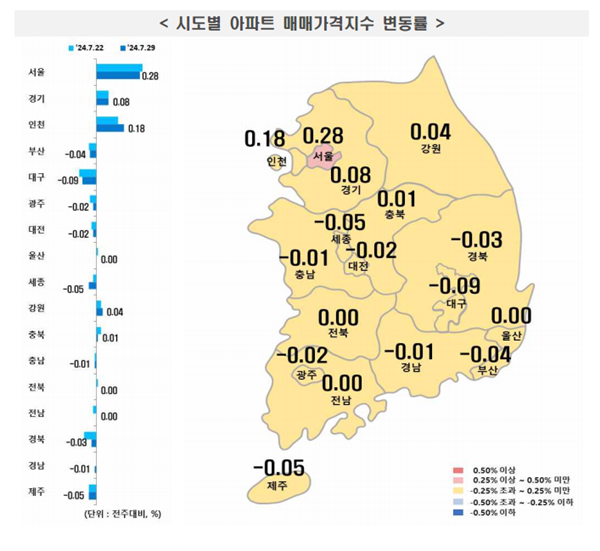 지방(-0.02%)은 시ㆍ도별로 부산(-0.04%), 대전(-0.02%), 대구(-0.09%), 충남(-0.01%), 충북(0.01%), 강원(0.04%), 광주(-0.02%), 울산(0%), 세종(-0.05%), 전남(0%), 전북(0%), 경남(-0.01%), 경북(-0.03%), 제주(-0.05%) 등의 결과를 보였다.