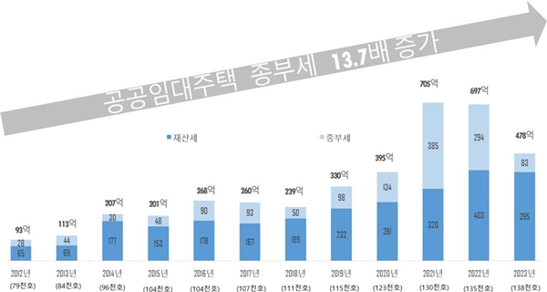SH가 보유 중인 공공임대주택 약 13만8000가구에 대한 종합부동산세 부담액은 2012년 28억 원에서 최고납부액 385억 원(2021년)으로 13.7배 증가했다.