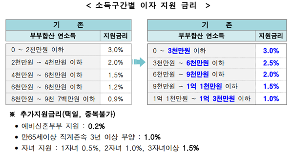자녀를 키우는 신혼부부에게는 자녀 추가 금리지원을 기존 최대 연 0.6%(자녀 1명당 0.2%)에서 최대 연 1.5%(자녀 1명당 0.5%)로 확대했다. 이로써 지원받을 수 있는 금리는 최대 연 4.5%가 된다.