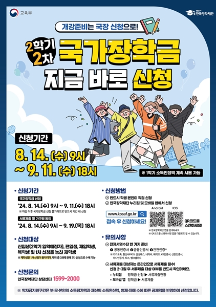 [아유경제=조명의 기자] 교육부(부총리 겸 교육부 장관 이주호)와 한국장학재단은 오는 14일부터 9월 11일까지 `2024학년도 대학생 2학기 2차 국가장학금` 신청을 받는다고 이달 12일 밝혔다.
