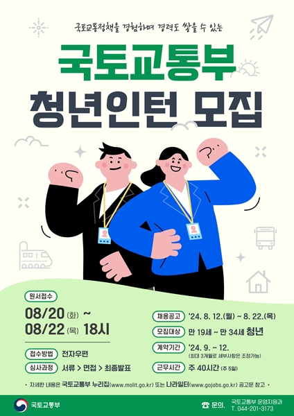 [아유경제=조명의 기자] 국토교통부(장관 박상우ㆍ이하 국토부)는 이달 12일부터 22일까지 하반기 청년인턴을 모집한다고 최근 밝혔다.