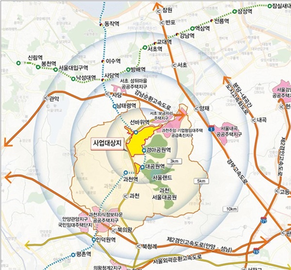또 지구 주변에 있는 우면산, 청계산, 관악산, 서울대공원 등을 연결하는 `녹지축 네트워크`도 만들어 탁 트인 도시경관을 제공할 계획이다.