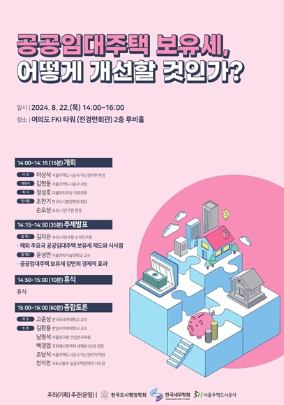 SH는 한국도시행정학회, 한국세무학회와 함께 오는 22일 여의도 FKI타워 2층 루비홀에서 `공공임대주택 보유세, 어떻게 개선할 것인가?`를 주제로 정책토론회를 개최한다고 밝혔다.