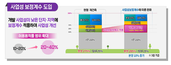 지가가 낮은 지역의 사업성을 개선하기 위해 사업성 보정계수를 신규 도입한다. 사업성 보정계수는 지가뿐 아니라 단지 규모ㆍ세대밀도 등을 고려해 허용용적률에 보정계수를 최대 2.0까지 적용(재개발은 지가만 고려)하는 제도다. 시는 현재 20% 수준인 허용용적률 인센티브 범위를 최대 40%까지 높일 계획이다.