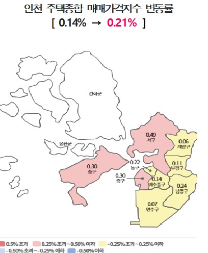지역별로는 서구가 0.49%로 가장 높고 ▲중구 0.3% ▲남동구 0.24% ▲동구 0.22% ▲미추홀구 0.14% ▲부평구 0.11% ▲연수구 0.07% ▲계양구 0.06% 등 순으로 상승했다.