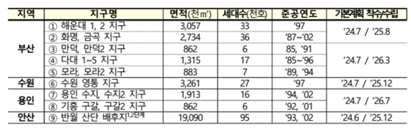 [아유경제=조명의 기자] 부산광역시 해운대1ㆍ2, 경기 용인시 수지, 수원시 영통, 안산시 반월 등 전국 9개 지구의 노후계획도시가 정비기본계획 수립에 착수한다.