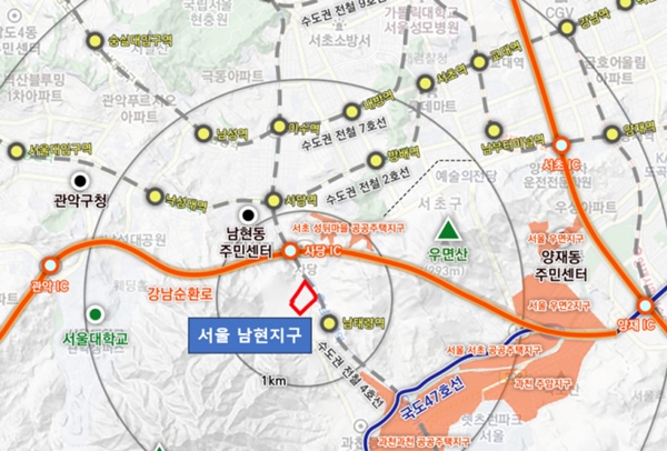 남현지구는 지하철 4호선 남태령역에서 200미터 이내 역세권에 위치한다. 대중교통으로 강남까지 20분 내에 갈 수 있으며 과천대로에 연접 및 강남순환로(사당IC)와도 인접해 있다. 관악산 자락에 위치하고 우면산ㆍ청계산을 마주해 자연환경이 우수하며, 예술의전당, 백화점, 대학병원 등 생활 인프라 접근성도 좋은 편이다.