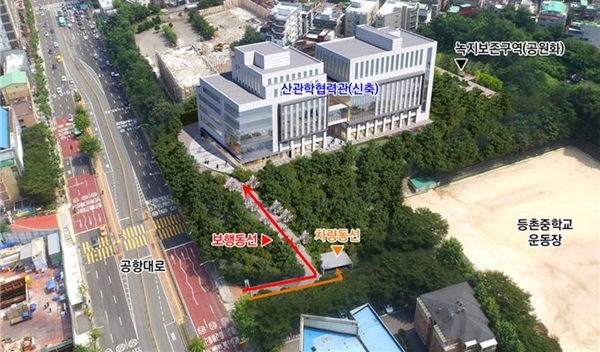오픈캠퍼스 실현 방안으로 협력관 신축 시 기존 담장과 급경사지로 형성돼 접근할 수 없었던 공항대로에서 저층 주거지로 이어지는 동측 보행로를 오픈광장과 연계해 인근 주민들을 위한 휴식공간도 조성한다.