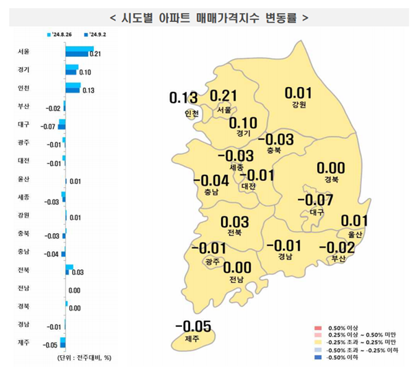 지방(-0.02%)은 시ㆍ도별로 부산(-0.02%), 대전(-0.01%), 대구(-0.07%), 충남(-0.04%), 충북(-0.03%), 강원(0.01%), 광주(-0.01%), 울산(0.01%), 세종(-0.03%), 전남(0%), 전북(0.03%), 경남(-0.01%), 경북(0%), 제주(-0.05%) 등의 결과를 보였다.