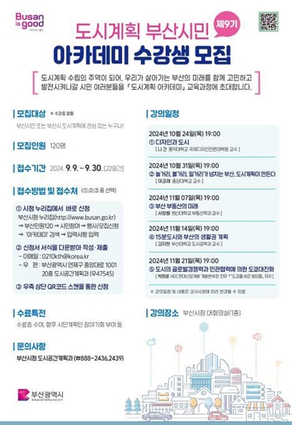 [아유경제=조명의 기자] 부산광역시가 이달 9일부터 30일까지 `제9기 도시계획 부산시민 아카데미` 수강생을 모집한다.