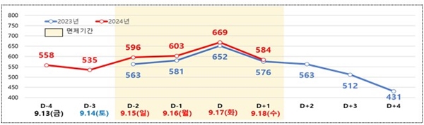 국토부에 따르면 대책기간 동안 총 3695만 명, 일 평균 616만 명이 이동하고, 이동 시 교통수단은 대부분 승용차(88.4%)를 이용할 것으로 예상된다. 고속도로 일 평균 통행량은 전년 대비 6.6% 늘어난 591만 대에 이를 전망이다.