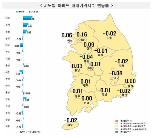 [아유경제=권혜진 기자] 최근 한국부동산원이 발표한 `주간아파트 가격동향`에 따르면 9월 3주(지난 16일 기준) 전국 아파트값은 상승(0.05%)을 기록했다. 수도권과 서울은 상승폭 축소, 지방은 하락폭 확대한 상황이다.