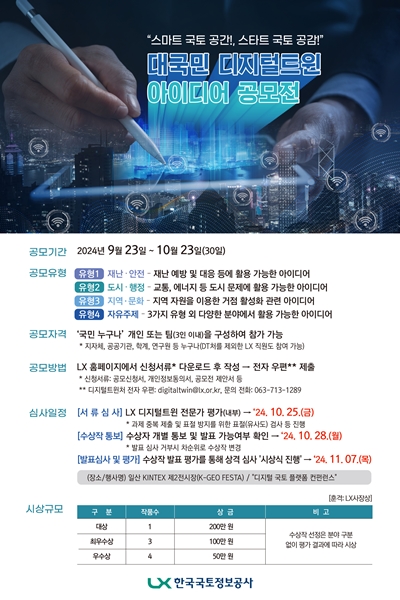 LX는 `스마트 국토 공간, 스타트 국토 공감`이라는 슬로건 아래 이달 23일부터 오는 10월 23일까지 30일간 `대국민 디지털트윈 아이디어 공모전`을 개최한다고 최근 밝혔다.