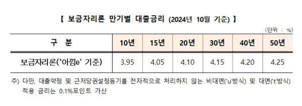 이에 `아낌e-보금자리론` 기준으로 연 3.95(10년)~4.25%(50년)가 적용된다.