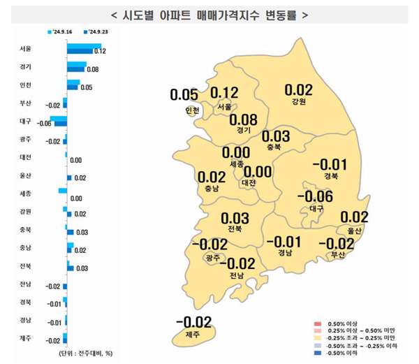 지방(-0.01%)은 시ㆍ도별로 부산(0.02%), 대전(-0.02%), 대구(-0.07%), 충남(-0.01%), 충북(0.01%), 강원(-0.01%), 광주(-0.02%), 울산(0.02%), 세종(-0.02%), 전남(0%), 전북(-0.02%), 경남(0.02%), 경북(-0.05%), 제주(-0.03%) 등의 결과를 보였다. 세종은 입주 물량 영향있는 가운데, 일부 구축 위주로 하락하며 하락 전환했다.
