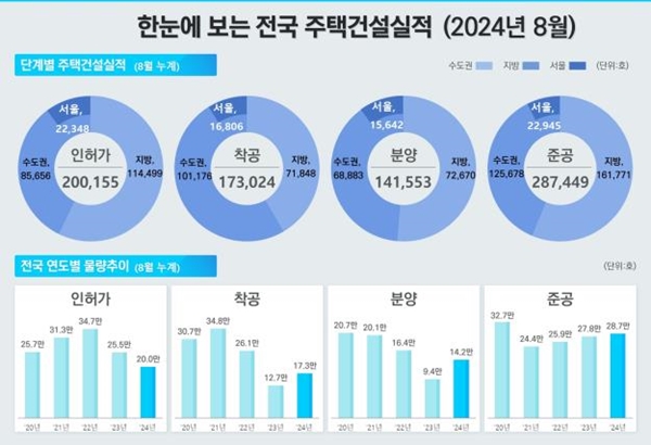 올해 8월 기준 인ㆍ허가와 착공, 분양, 준공은 모두 전월 대비 증가했다. 인ㆍ허가는 2만8478가구로 전월(2만1817가구) 대비 30.5% 증가했다. 다만 전년 동월(3만2458가구)와 비교해서는12.3% 감소했다. 착공은 2만9751가구로 전월(1만6024가구) 대비 85.7% 증가했으며 전년 동월(1만4261가구) 대비 108.6% 늘었다. 분양은 1만6077가구로 전월(1만2981가구) 대비 23.9% 증가했으며, 전년 동월(1만4818가구) 대비 8.5% 증가했다. 준공 역시 3만8844가구로 전월(2만9045가구) 대비 33.7% 늘었다.