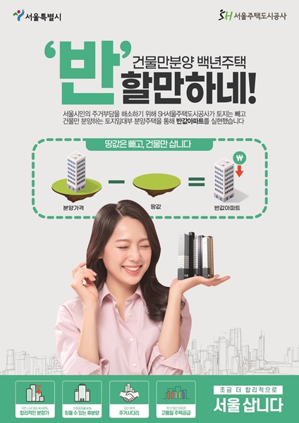 [아유경제=조명의 기자] 서울주택도시공사(SH)가 국토교통부에 뉴:홈 나눔형 주택인 토지임대부 분양주택(건물만분양 백년주택)의 나눔형 전용 모기지 적용 여부를 결정해 달라고 요청했다고 최근 밝혔다. 국무조정실에는 청년과 신혼부부 주거 안정을 위해 도입 지원을 요청했다.