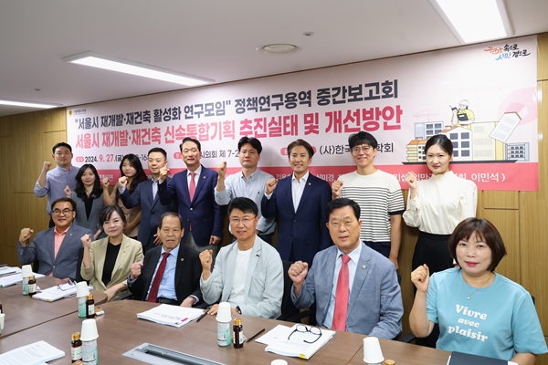 [아유경제=조명의 기자] 서울시의회 의원연구단체 서울시 재개발ㆍ재건축 활성화 연구모임이 지난 9월 27일 서울시의회 의원회관에서 `서울시 재개발ㆍ재건축 신속통합기획 추진실태 및 개선방안` 정책개발연구용역 중간보고회를 개최했다.