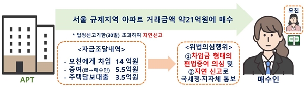 서울 용산구 한 아파트를 21억 원에 매수한 A씨는 모친에게 차입한 14억 원, 증여받은 5억5000만 원, 주택담보대출 3억5000만 원으로 매매비용을 조달했다. 본인의 자금은 전혀 없이 전액을 타인에게 받은 금전과 대출로 아파트를 구매해 편법 증여가 의심됐다.