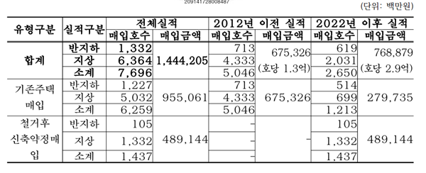 실제로 SH는 반지하 주택 7696가구를 매입하는 데 약 1조4000억 원(가구당 1억8000만 원)을 투입한 바 있다. 2022년 이후 매입한 반지하 주택의 경우 부동산 가격 상승으로 인해 가구당 평균 2억9200만 원에 달하나, 국비 지원은 가구당 1억8200만 원에 불과해 부족한 비용 1억1100만 원을 부담하고 있다.