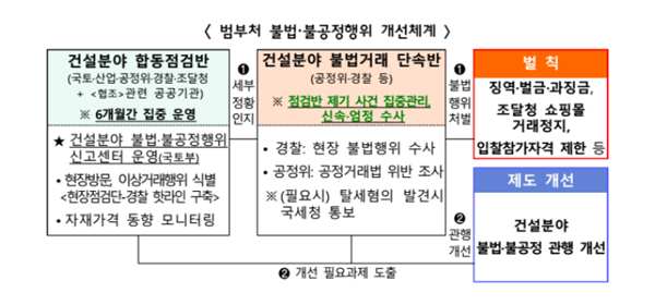 주요 점검 대상은 ▲가격 담합, 입찰 방해 등 건설시장의 정상적인 가격 결정을 방해하는 행위 ▲공공조달 자재의 납품 지연, 품질 불량 ▲금품 요구, 공사 방해 등 건설현장 불법ㆍ불공정 행위 등이다.