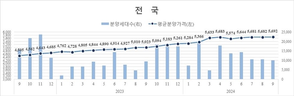 이달 15일 주택도시보증공사(HUG)가 발표한 `민간아파트 분양가격 동향`에 따르면 전국 민간아파트 최근 1년간 ㎡당 평균 분양가격(공급면적 기준ㆍ이하 ㎡당 평균 분양가격)은 2024년 9월 말 기준 569만2000원으로 집계됐다. 전월(568만2000원)과 비교해 0.16%, 전년 동월(569만2000원)보다 13.31% 오른 셈이다.