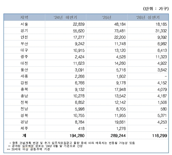 연도별로 보면 ▲2024년 하반기 19만4280가구 ▲2025년 28만9244가구 ▲2026년 상반기 11만6299가구가 입주 예정인 것으로 파악됐다.