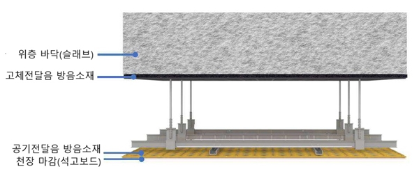 층간소음은 바닥과 벽체와 같은 고체전달음이 공간을 통해 공기전달음으로 바뀌며 발생하는데, 두 전달음의 저감에 효과적인 각각의 방음소재를 활용해 효율을 높인 것이다.