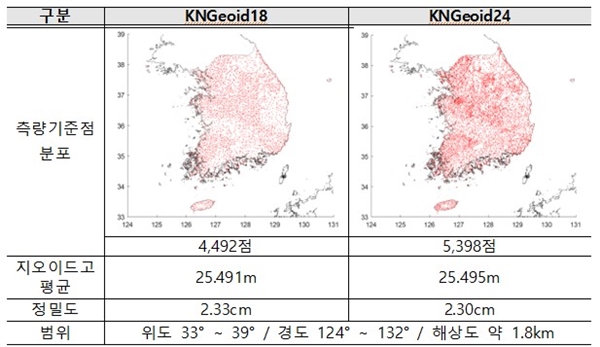 이번 국가 지오이드모델은 최신 국가기준점의 정밀 높이값을 반영해, GNSS 높이측량의 정밀도를 향상시켰다. 전국 평균정밀도는 2.33㎝에서 2.30㎝로, 평지는 2.15㎝에서 2.03㎝로 높였다.