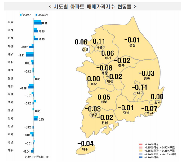 지방(-0.03%)은 시ㆍ도별로 부산(-0.07%), 대전(-0.02%), 대구(-0.11%), 충남(0%), 충북(-0.02%), 강원(-0.01%), 광주(-0.03%), 울산(0%), 세종(-0.08%), 전남(-0.02%), 전북(0.05%), 경남(-0.01%), 경북(-0.03%), 제주(-0.04%) 등의 결과를 보였다.