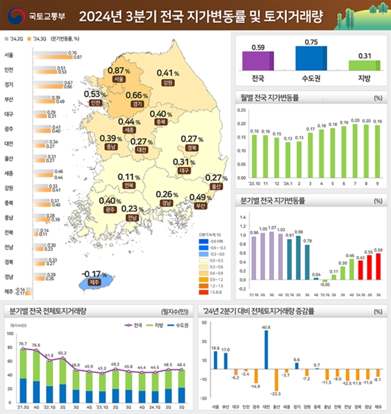 최근 국토교통부(장관 박상우)와 한국부동산원이 발표한 올해 `3분기 지가변동률 및 토지거래량`에 따르면 올해 3분기 전국 지가는 0.59% 상승해 전분기(0.55%)대비 0.04%p 확대됐다. 지난해 3분기(0.3%)와 비교해도 0.29%p 높게 나타났다.