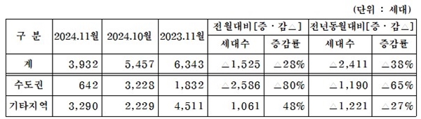 이는 전월(5457가구) 대비 1525가구(28%) 감소한 수치다. 전년 동월(6343가구)과 비교해도 2411가구(38%)나 줄었다.