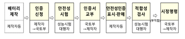 배터리가 안전기준 등에 적합하게 제작된 경우 국토부가 인증서를 교부하며, 제작자는 알아보기 쉬운 위치에 안전성 인증표시를 해야 한다.