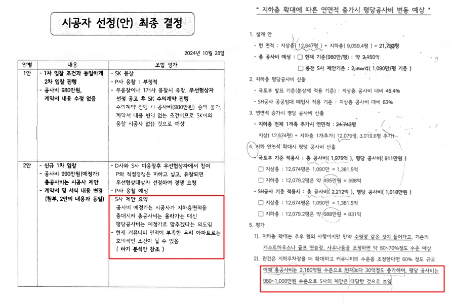 이때 조합은 1000만 원이 넘는 평당 공사비가 부담되자, 지하층 면적을 증가시켜 평당 공사비를 1000만 원 아래로 맞춘 자료를 배포한 것으로 알려졌다. 전체 연면적을 증가시켜 평당 공사비를 낮아 보이는 착시효과일 뿐, 결국 전체 공사비는 늘어나고 그만큼 조합원 부담도 증가하게 된다는 게 일부 조합원들의 지적이다.