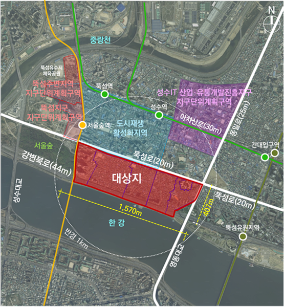 성동구 성덕정5길 18-2(성수1가) 일대 53만399㎡ 규모의 성수전략정비구역은 `한강르네상스계획`의 일환으로 2009년 전략정비구역으로 지정됐다. 이어 2011년 재개발 정비계획 수립ㆍ정비구역이 결정됐으나 도시정비사업이 동시에 시행돼야 조성할 수 있는 대규모 기반시설이 많은 데다 지역 내 이해관계, 정책ㆍ제도 변경 등으로 인해 오랜 기간 사업 추진에 난항을 겪었다.