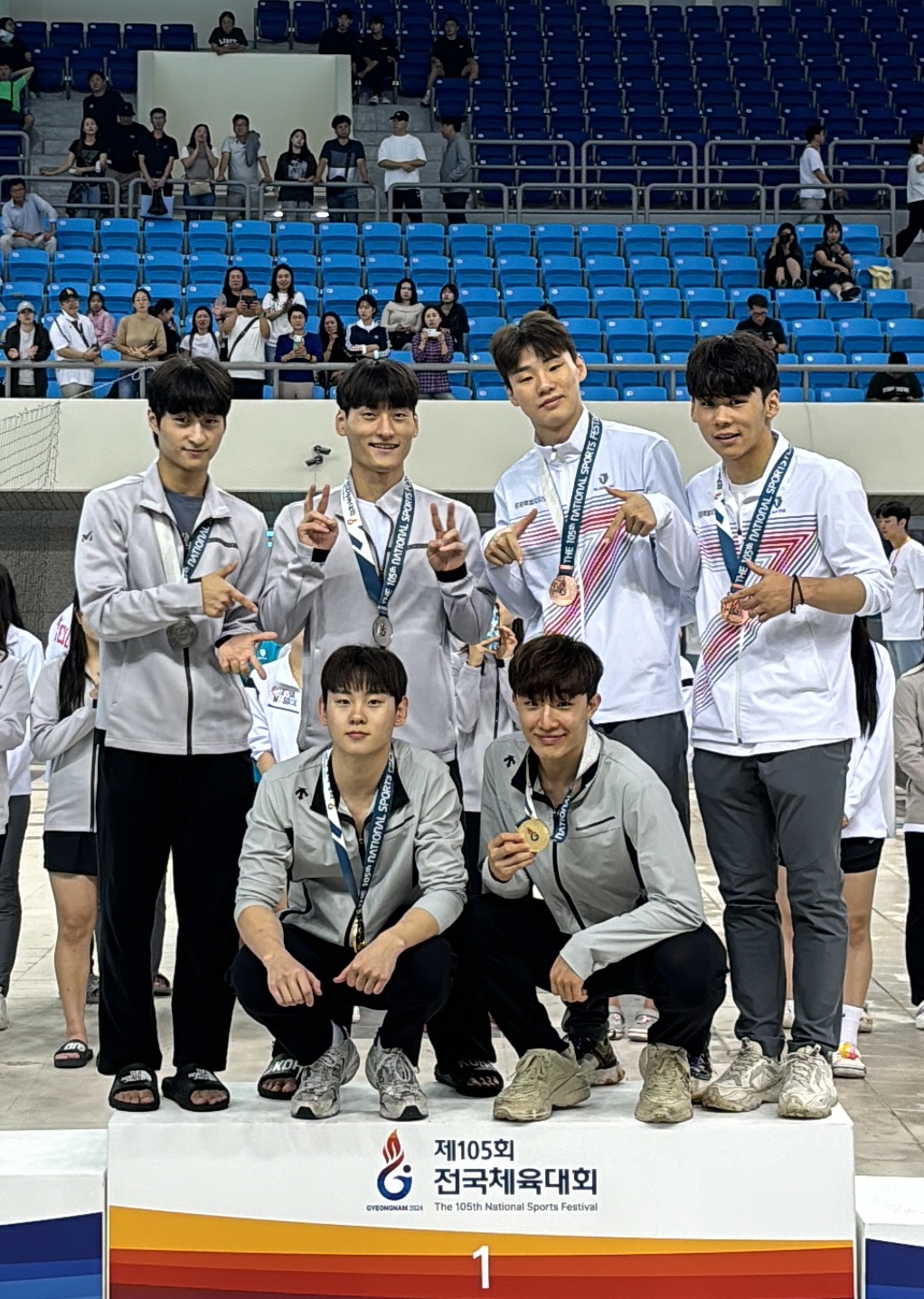 전국체전 다이빙 경기 종료 후, 김영택·김영호 선수를 비롯한 수상자들이 한자리에 모여 기념 촬영을 했다. 치열한 경쟁 속에서도 서로를 축하하며 환한 미소를 짓는 모습이 돋보인다. 이번 대회에서 멋진 활약을 펼친 선수들의 열정과 노력에 큰 박수를 보낸다.