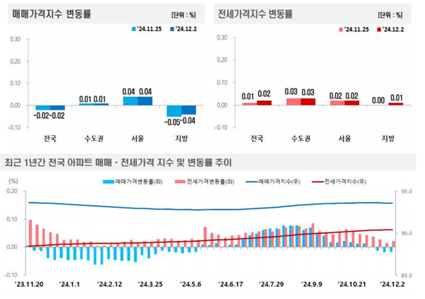 [아유경제=권혜진 기자] 최근 한국부동산원이 발표한 `주간아파트 가격동향`에 따르면 12월 1주(지난 2일 기준) 전국 아파트값은 하락(-0.02%)을 기록했다. 수도권 및 서울은 상승폭 유지, 지방은 하락폭 축소한 상황이다.