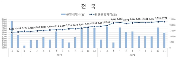 서울을 비롯해 5대 광역시ㆍ세종시, 기타 지방 모두 상승하며 역대 최고치를 기록한 가운데 수도권만 소폭 하락했다. 지난달(11월) 말 서울 민간아파트의 평균 분양가는 ㎡당 1428만 원으로 전월(1420만3000원)보다 0.54% 올랐고, 전년 동월(1024만7000원)에 비해서는 38.01% 상승했다.
